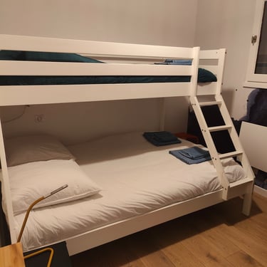 Un couloir dessert un toilette indépendant avec son lavabo, une chambre triple avec lit superposé (un lit 140 et un lit 90) avec télévision, Xbox, et placard, une chambre double et ces rangements, une salle de bain avec grande douche à l'italienne, double vasques et WC sanibroyeur. Une buanderie est accessible avec machine à laver, sèche-linge