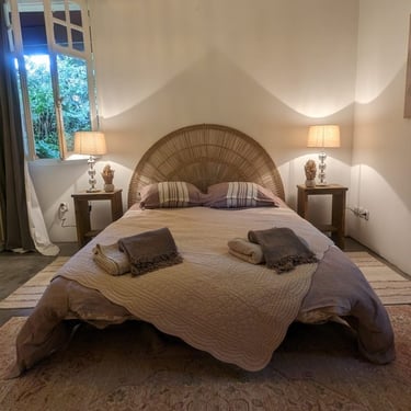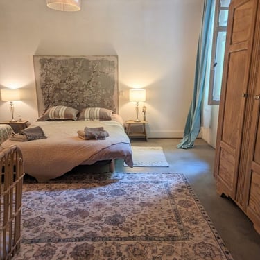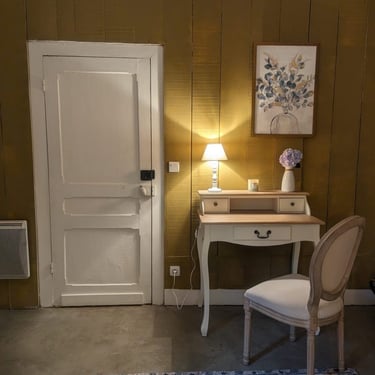Hortense, clin d’œil aux hortensias du jardin. Spacieuse, elle saura vous faire passer une nuit paisible dans sa literie en 160 cm. Vous y trouverez une grande salle de bain, douche et toilette indépendant.