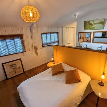 Dans le salon, vous trouverez une mezzanine mansardée avec un lit double protégé par un garde de corps.