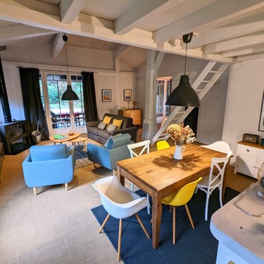 Vous y trouverez, un grand salon/salle à manger avec son poêle à bois et sa vu sur la piscine, ainsi qu’une cuisine semi ouverte tout équipée (frigo, lave vaisselle, four, plaque induction et micro-onde).